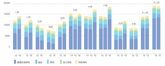 2015年示范楼全年总运行电耗为34.2kWh/(m2.a),其中暖通空调和照明运行电耗为21.6kWh/(m2.a), 比设计目标25 kWh/(m2.a)降低13.7 %。