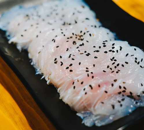 这道刚上市的越南巴沙鱼片都是现切现卖,艺星绝对不会给食客上冷冻过的鱼。白嫩带些粉色的鱼肉平铺于碟面,整齐的摆放,现切现上,再撒上满满的黑芝麻,看上去就很有食欲。
