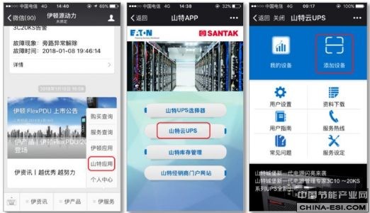 Winpower Cloud方案目前适用于山特城堡1K、2KS、6K、10KS、3C15KS、3C20KS、RACK 2K、RACK3KS、C10K RACK、C6KS RACK等机型。进入微信公众号“伊顿源动力”,选择菜单栏“伊服务-山特应用-山特云UPS”,点击“添加设备”将手机摄像头对准UPS背面Winpower Cloud Card片二维码,扫描UPS背部序列号标签上的一维码xxxxxx-xxxxxxxx,确认添加设备。设备添加成功后,跳转到产品信息页面,可显示UPS名称、位置、型号、序列号和UPS基本信息。用户也可在设备列表中查看当前设备的实时状态,进行各种功能性操作。