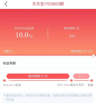 捞财宝12期月月宝,借款期限355天,协议约定利率:10%(悄悄地说:智投宝封闭期一年的产品协议约定利率一般是9.5%),持有45天可转让,换句话说,如果有流动性需求后转让成功,即使你持有1个多月也能享受10%,但一般人应该都会选择更长时间地持有。