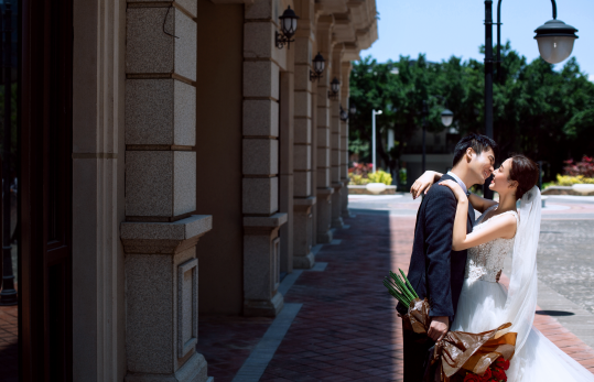 同样道理,当新人的眼睛正对镜头时,身体可以转成一定的角度,这样画面会显得更有生气和动势,还有立体感。