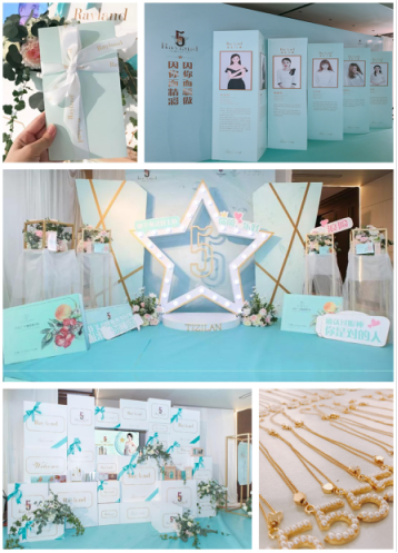 午后14:00时,洋溢着自信风尚的贵宾小仙女儿,走上蒂芙尼格调的红毯,并在星光墙上留下自己的签名,专业摄影团队的闪光灯连续不停,为她们留下最完美的倩影。随后贵宾们领取了5周年纪念伴手礼,认真观赏精心布置的形象文化展厅:这里陈列着四大系列产品,轮回播放着集体活动视频,记载着五年的历史荣耀,展示着高级代理的风采秀,是瑞蘭集团五年来辉煌历程的缩影!