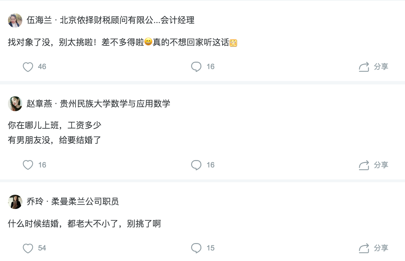面对烦恼,一些脉脉用户表示,自己已经做好了准备。某公司品牌总监张向颖就说:对象谈了,婚也结了,娃也生了,连二胎都生了!现在该轮到我脸上挂着姨母般的微笑问别人啦!