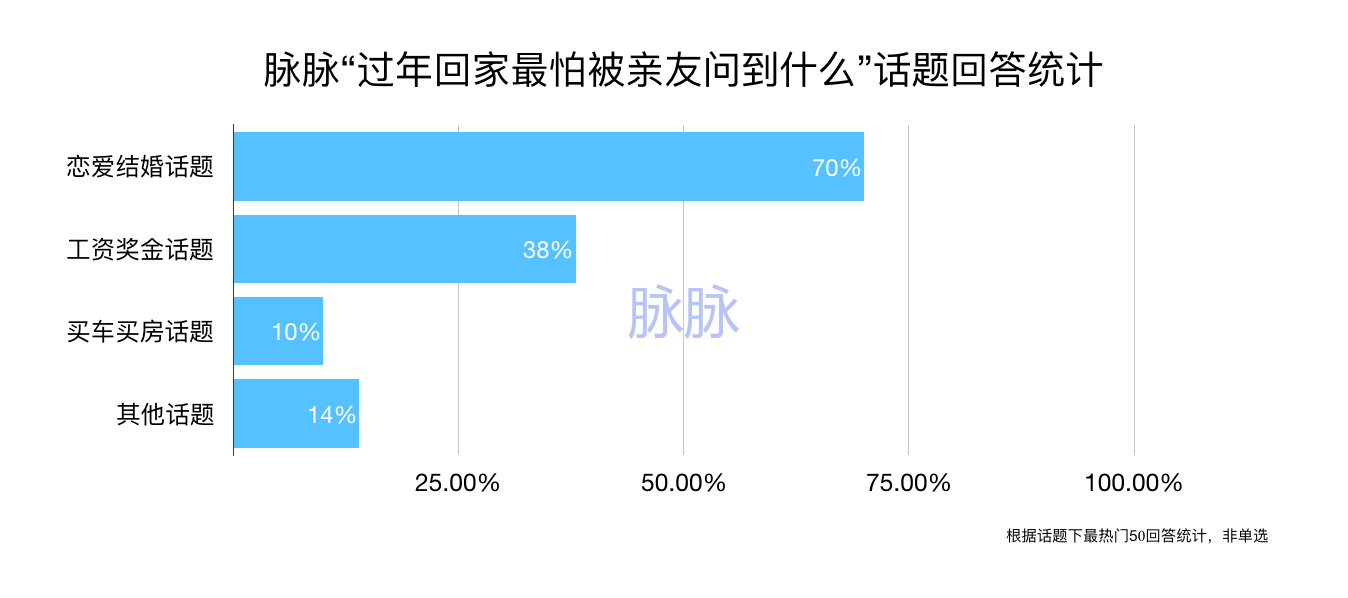 如果你回到家里,也会被这三连问当头一棒,不要哭泣,因为你不是一个人。根据脉脉对 “最怕被亲友问到什么?”话题下最热门的50个回答的统计,35条回答提到“有对象了吗?”为代表的婚恋话题,占到整个回答的70%,是出现频率最高的问题,顺利成为职场人过年最怕被问的问题TOP1。