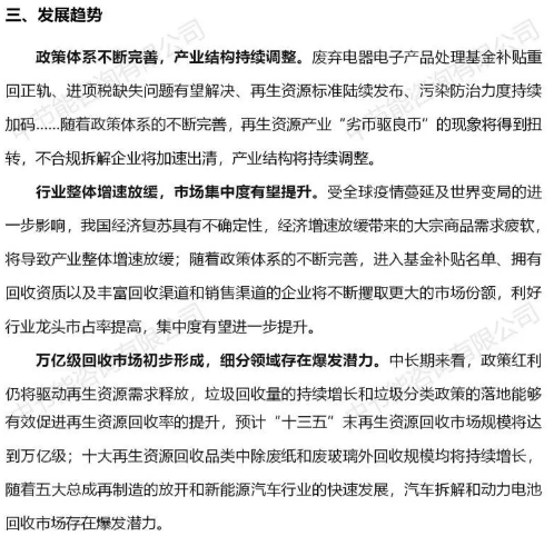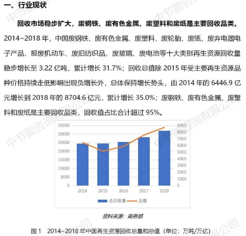北极星固废网获悉,近日,中节能咨询有限公司发布了回收利用行业研究(简版),从行业现状、竞争格局、发展趋势和风险提示四方面入手,对再生资源行业进行了分析,详情如下: