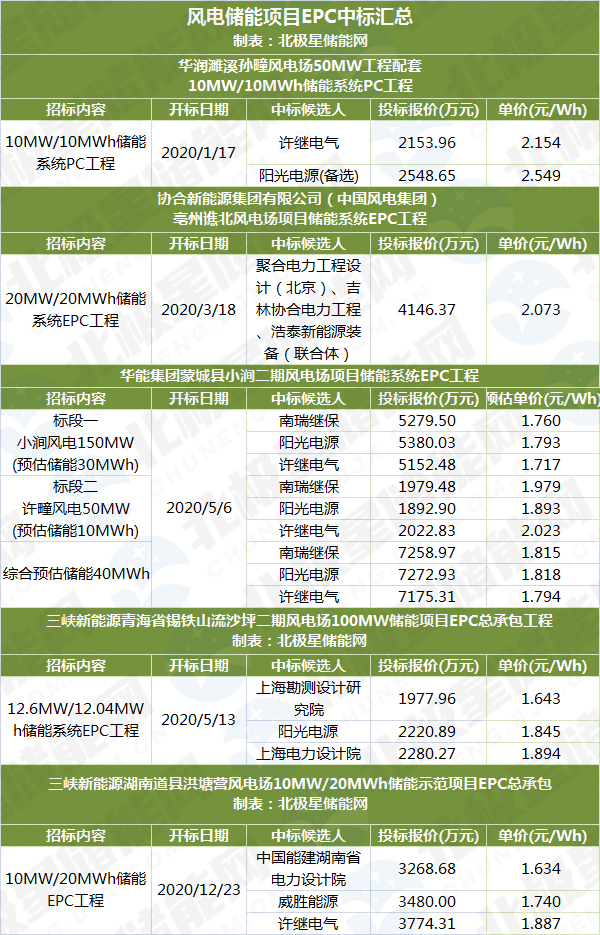 2020年风电储能项目中标详情如下。