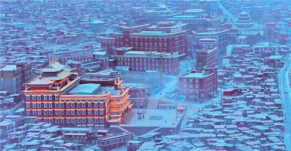 雅家埂的旅游环线与省道泸—石公路211线相连,而这条路的终点又与国道318线相接。开着长城炮一路在318国道上小心驾驶,我的速度几乎放到了最缓,有些路段,我更是开启了蠕行模式,现在想来,也是一段惊险自驾记忆,而这样的高强度驾驶直到我们抵达色达。到了县城,去预定好的酒店狠狠地睡一觉,化身“干饭人”补充体力后,我带着女友来到佛学院,大雪与色达的红屋形成强对比画面,无形中赋予这里一种庄严圣洁之感。