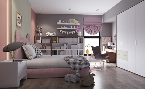 儿童房则更象征着一个家庭的传承和延续,对于孩子来说儿时的薰陶很重要,后天的培养更关键,所以一个舒适的学习环境尤为重要,在模块式书柜里读书破万卷,于胡桃木工作台下笔如有神,而双色烤漆的衣柜,总能给她嘘寒问暖的四季呵护。