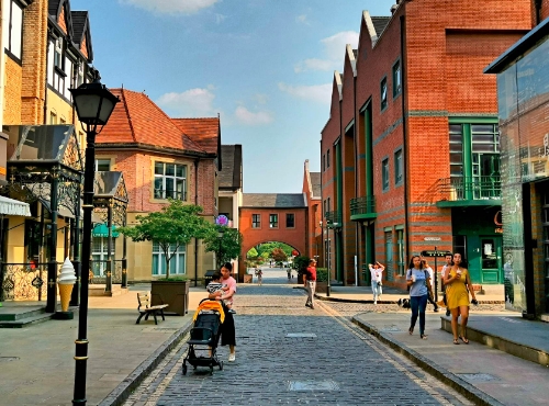在欧拉好猫的护航下,我很快来到了泰晤士小镇,小镇的设计引入英国泰晤士河边小镇风情和住宅特征,浓烈的现代化和厚重的古典主义美学气息交相辉映,而这也与欧拉好猫复古未来主义设计理念相得益彰。