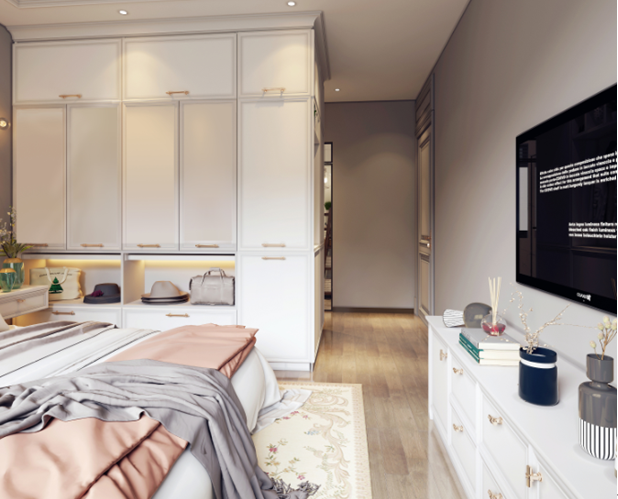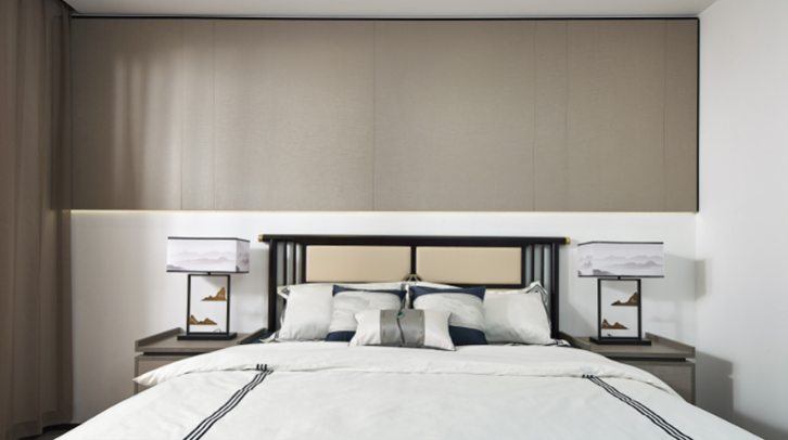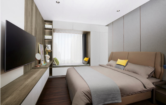 不同于常见的压贴工艺,云涧采用绒面质感、欧洲原版纸、双层压贴技术的门板饰面板。仿若凹凸有序的紧密绒毛或绒圈的视觉立体感,以奢华表面效果和浓郁饱满的色彩给主人进门前的温暖与亲密,好似母亲子宫内的安全与舒缓。推开卧室的门,陷入柔软的床,入眼的是轻巧的电视柜和不同规格的组合护墙板,淡雅出尘的配色,逼真还原木理质感,满足了人们超强的“视觉”空间冲击,低调静雅的中式元素打破卧室的沉闷感,不仅达到了美观的效果,还兼具了超强的实用性。下方配以隐藏的氛围灯带,成年人的睡眠故事伴你入眠。通透的灰色玻璃衣柜门将杂尘挡在门外,而心头的爱物触目即是,长抽屉盛满贴心,飘窗柜锁住过季回忆,心事几重,妥帖收纳。锦绣人生,从“云涧”卧室开始。