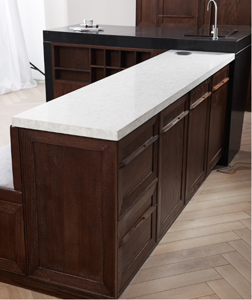 连理自上市以来到如今能一直受消费者的关注和青睐,在很大一方面是因为出色的产品设计能够做到真实打动消费者的内心,为生活带来一种与众不同的体验。连理在选择原材时经过多个维度的对比,最终选择了进口特等北美红橡木,这种木材木质坚硬经久耐用,非常适合做橱柜的原材,同时高端的原材也为连理奠定了高品质的产品基调;作为柏厨家居经典的新中式风格厨房产品的代表作,连理在设计上也在尽力还原中式木作工艺的经典传承之美,比如高柜端侧纯实木竖向开放柜,搭配特有抽插隔板,就致敬了古典中式家具设计;独特的原创梭形纯实木拉手与具有历史感的木纹门板一体化设计,传递出“时光如水,岁月如梭,情意历久弥坚”的美好寓意。