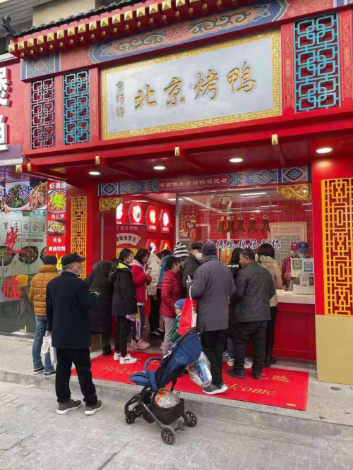 “大约十一点的时候吧,店门口的顾客就已经自发排起了队伍。从开业到现在,几乎没有出现过卖不完的情况,一般烤鸭刚烤好就直接销售一空了。卖断货在我们这里是司空见惯,有些顾客排了一个多小时的队有时候也买不到,没办法生意太好了!”京师傅北京烤鸭松江区一家直营店的店员无奈的说道。