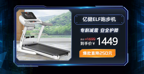 连续5年天猫双十一跑步机销量冠军——亿健精灵ELF跑步机在本次活动中给出了诚意十足的优惠,在活动时间内购买产品直降250元。亿健精灵ELF内置天猫精灵,支持语音控制解放双手操作更加便捷;搭配无刷静音电机,保持充沛动力营造静音的运动环境;采用AI柔性减震技术,实现峰值20mm的缓冲空间,全面吸收运动时的冲击力,保护用户膝盖不受损伤;除此之外这套减震系统中内置4种AI场景减震模式,用户可以在使用中体验沙滩、草地、公路、塑胶场景等不同路况的减震跑感。