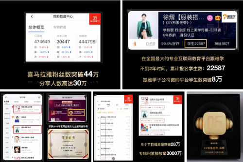 短短六年时间,先后在各大线上平台推出600余篇原创声音,吸引听众粉丝60万+、付费用户2万+;在国内最大的专业互联网教育平台“跟谁学”累计报名学员2.2万余名,“跟谁学”子公司微师平台学员数突破8万,直接影响受众超50万,带领无数爱美人士在主流与个性之间找到了属于自己独一无二的自由独立之美,并先后获得“中国品牌创新发展工程优秀企业”等一系列荣誉。