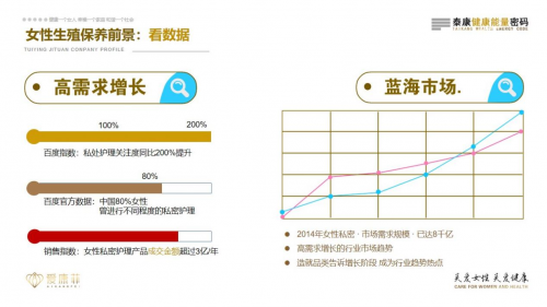 先了解下市场前景。当前,随着人们生活品质的提高,对于私密健康方面也越来越重视,据统计,中国每年都会有20万人死于妇科病,中国妇女宫颈癌的发病率占全球1/3。女性私处的健康威胁比男性高10倍。在中国,每年有许多女性感染炎症,女性身体特别敏感的经期、孕期、产褥期更是感染妇科炎症高发期,成为影响女性健康的巨大隐患之一。巨大而刚性的需求造就了私密健康这一市场广阔的发展前景。