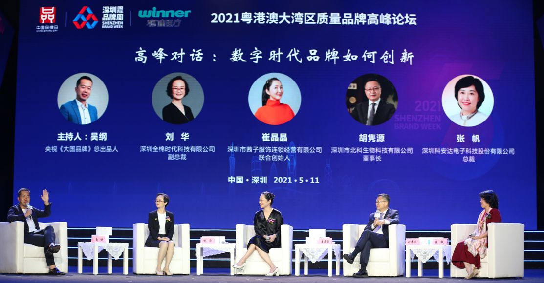 央视《大国品牌》总出品人吴纲,与深圳全棉时代科技有限公司副总裁刘华,深圳市茜子服饰连锁经营有限公司联合创始人崔晶晶,深圳市北科生物科技有限公司董事长胡隽源,深圳科安达电子科技股份有限公司总裁张帆,围绕“数字时代品牌如何创新”,就“数字经济如何支持新发展格局?”,共同探讨了“企业如何运用商业创新打破增长瓶颈”、“数字时代,如何建立自己的品牌语言,打出差异化”、未来值得关注的商业机会和发展趋势”、“不断变化的互联网发展趋势中,企业需要注意哪些风险”等话题。