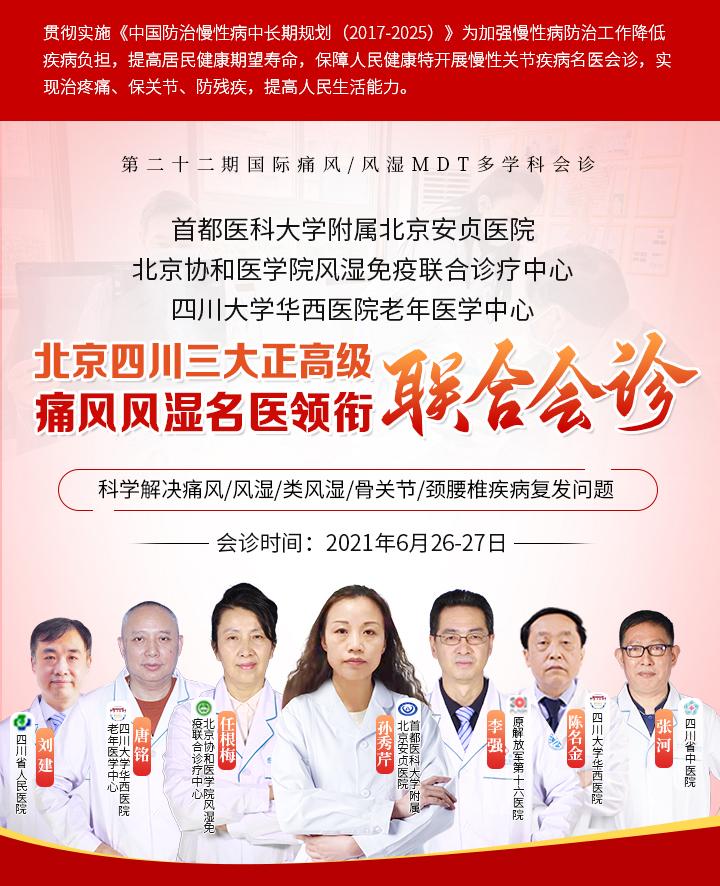 2021年6月26日-27日,首都医科大学附属北京安贞医院孙秀芹主任医师、北京协和医学院风湿免疫联合诊疗中心主任任根梅、四川大学华西医院老年医学中心唐铭主任等知名医师,受邀莅临成都开展“疑难关节病联合会诊”活动。