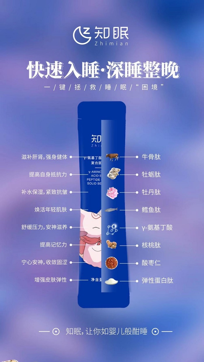 知眠γ-氨基丁酸弹性蛋白肽复合固体饮料中含有可以滋补肝脏、强身健体的牛骨肽、提高抵抗力的牡蛎肽、补水保湿的牡丹肽、焕活年轻肌肤的鳕鱼肽、舒缓压力安神滋养的γ-氨基丁酸,改善记忆力的核桃肽、宁心安神的酸枣仁、改善皮肤弹性的弹性蛋白肽等,无一不是具有镇静安神、舒缓神经的天然原材料,大脑神经平稳了,身体素质提升了,心静下来了,睡眠自然会得到改善。