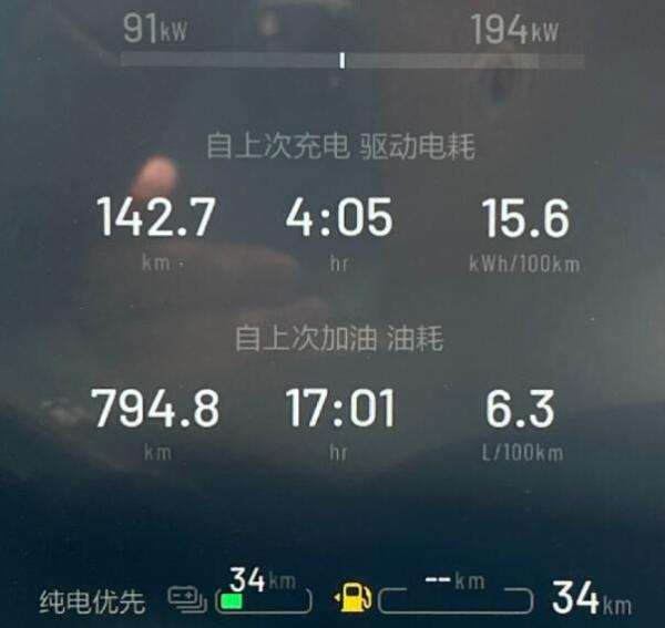 最终测得纯电续航142.7公里,约为NEDC续航的92%,WLTC续航的116%。最终测得燃油续航794.8公里,达到了NEDC续航的89%,WLTC续航的117%。实际加油量53.5L,实测油耗6.73 L/100km。