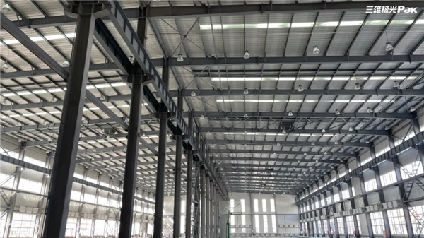 在厂房照明中,灯具的选择不仅关系到工作环境的整体照度,也会影响后期维护和运营成本。考虑到上述项目面积广阔,用灯数量大;棚顶较高,照度要求高;用灯时间长,用电量大;高压作业,需避免眩光等多种因素,三雄极光在照明设计实施中量身定制了一款大功率、照射角度广、照度均匀、无眩光、无频闪的悬挂灯——星空系列LED悬挂灯。