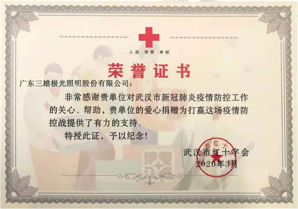2020年初,新冠疫情来袭,三雄极光火速驰援抗疫一线,第一时间主动联系武汉当地政府和应急医疗工程项目团队,全方位调动企业产能,极力配合做好火神山医院建设工程项目灯光设计和灯具选型等工作,大爱义举备受社会各方赞誉。