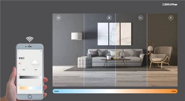三雄极光全屋智能照明系统的人性化不止于此,它能遵循自然旋律以健康照明为主导,根据季节和体感温度调节色温,使光渲染整个空间,让用户享受冬暖夏凉的舒适氛围。