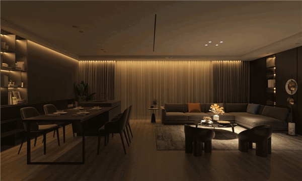 作为家中最重要的区域之一,客厅光源的布置尤其考验技术的成熟性。在这个空间里,天花板可以嵌入筒灯、射灯或者灯带,并以轨道射灯洗墙。居室中每个细分空间中均有光源,彼此独立而又不分彼此。而对于一般家庭来讲,客厅担负了最多的功用和最丰富的需求。比如日常会客或者看书需要明亮的光线,看电视或看电影又需要光线变暗,多人同时在空间进行不同活动则需要不同灯光组合。