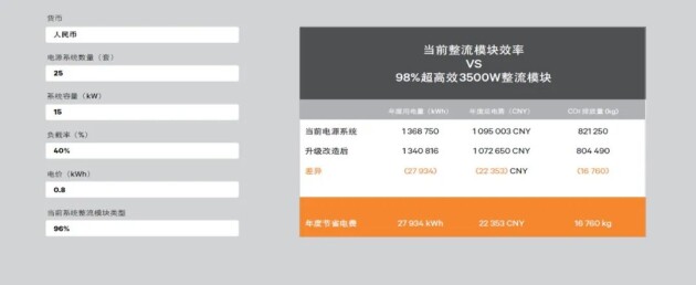 稳步增长的移动物联网业务、激增的边缘计算需求、不断扩展的物联网应用,以及 5G 网络的出现,驱动靠近终端用户侧巨大的计算需求。这意味着未来将建设海量的通讯基站以及配套的电源系统,能源效率的重要性比以往任何时候都更为突出。随着 98% 超高效整流模块的应用,可以大量节省 OPEX 并减少温室气体排放,助力运营商“双碳目标”的实现。
