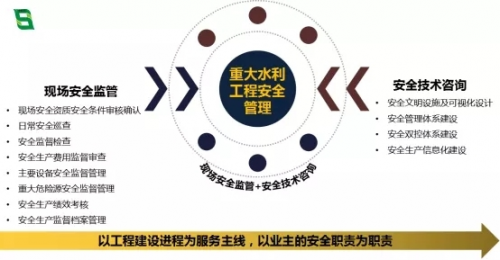 一直以来,博晟安全作为提供国内水利行业第三方安全监管服务的先行者,以“工业互联网+安全生产”为服务依托、以工程建设进程为服务主线、以业主的安全职责为职责、结合工程安全管理需求和法规政策要求,利用多媒体、信息化技术,运用第三方专业和资源优势,组建集土建、机电、电气、消防、环保、安全等力量于一体的专业队伍,为重大水利工程提供全过程全方位的现场安全监管+安全技术咨询服务,充分发挥第三方安全监督管理的实力和模式特点,全面解决重大水利工程建设项目安全管理难题。