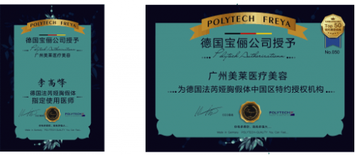 广州美莱凭借着强大的品牌力,以及专业的美胸专家团队、先进的医疗设备等综合技术力,特别授予广州美莱医疗美容《德国法芮娅胸假体中国区特约授权机构》,同时授予广州美莱医疗美容胸部整形学科带头人李高峰《德国法芮娅胸假体指定使用医师》。为广州美莱隆胸专业的众多荣誉与背书中又添砖加瓦。通过这样的技术认证和资质认证,也将给高端爱美女性提供更多的选择依据。