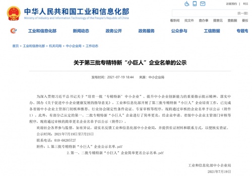2021年7月19日,中华人民共和国工业和信息化部中小企业局公示第三批专精特新“小巨人”企业认定名单,深圳市华思旭科技有限公司凭借创新的技术、产品及市场优势被认定为第三批专精特新“小巨人”企业。