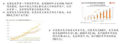 电子烟是近年新兴产品,因其口味独特,只含产生多巴胺的尼古丁提取物,无烟油等杂质,又加入芒果、蓝莓、薄荷各种口味,吸引了越来越多的消费者尤其是年轻人加入电子烟的阵营。专家预测,未来5-10年,传统烟草30%以上的市场份额被电子烟蚕食,面对快速扩大的市场,整个产业链也是发展迅猛,近年来,线上线下销售金额急剧上升。