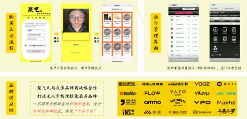 聚气儿目标是打造国内最酷的智能化零售平台,定位为为客户提供电子烟行业智能化零售解决方案。从上游供应链(与电子烟头部众多品牌达成官方战略合作),到未成年人保护系统(身份证+人脸核验识别)、货柜硬件体系、实时支付分账等技术支持,通过完善的交易结构保证模式的合规合法和快速复制,并保证对于合作伙伴的整体培训和运营支持。