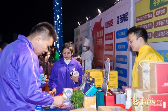 活动当晚的上海外滩霓虹闪烁、音乐欢快。会场内,各条景观示范带的特色产品悉数登场,每个展台的特产琳琅满目,推介官盛装出席,热情带货,吸引嘉宾围观品尝。