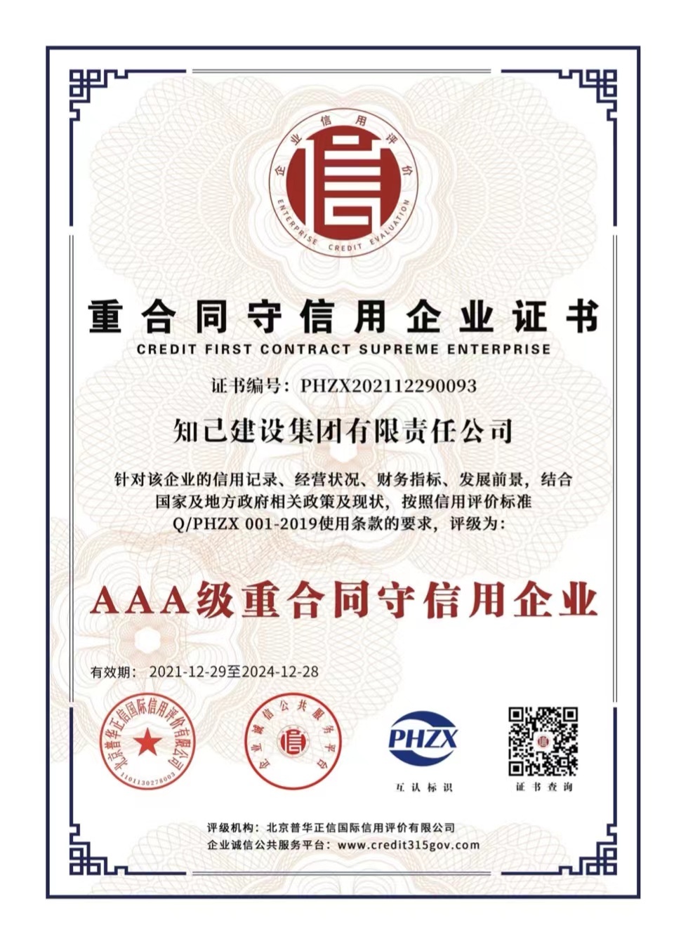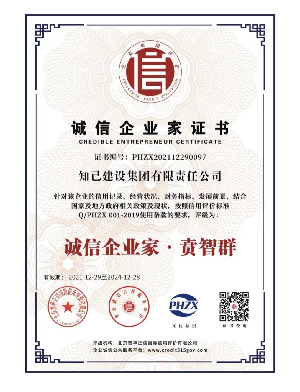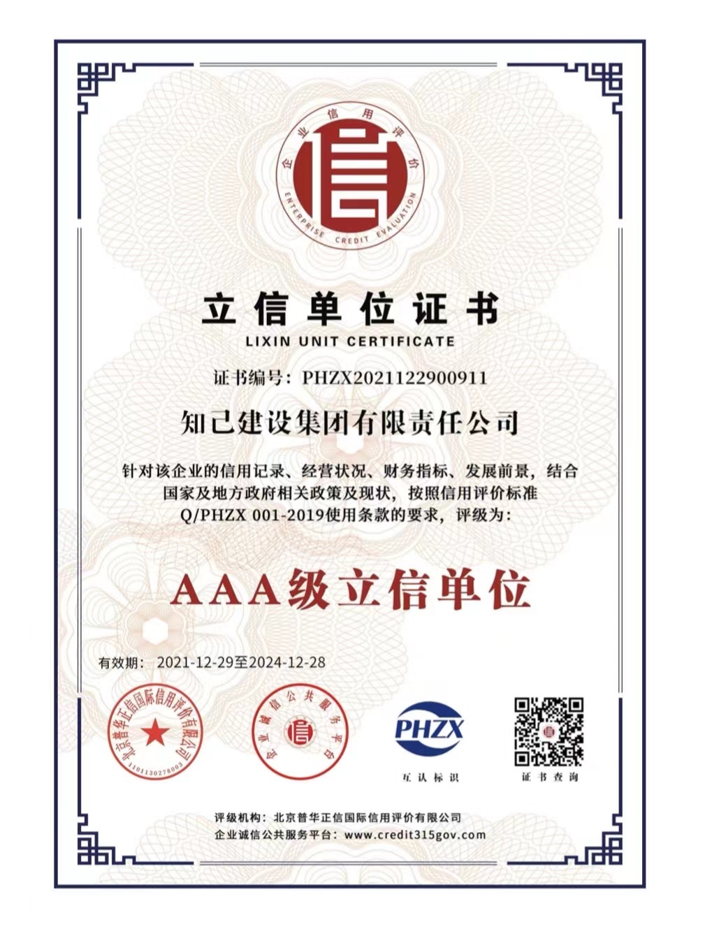 近日,知己建设集团有限责任公司完成了企业信用评级工作,被全国企业诚信公共服务平台、北京普华征信国际信用评价有限公司评为“AAA级信用企业”“AAA级诚信经营示范单位”“AAA级质量服务诚信企业”“AAA级重合同守信用企业”“AAA级诚信供应商”、立信单位“AAA级”、企业资信“AAA级”。同时,知己集团董事长贲智群被评为“诚信企业家”并获得荣誉证书。