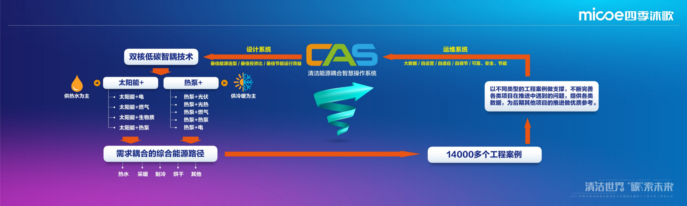 CAS+是四季沐歌基于“多能互补推动传统能源转型,智慧解决方案让能源更清洁”的理念,打造的最新解决业务场景的数字化工具,由MDi清洁能源耦合算法设计系统 V1.0和MYi 四季沐歌清洁能源智慧云控平台V3.0组成,对多种清洁能源耦合集成一站式解决提供入口和出口的端对端方案。