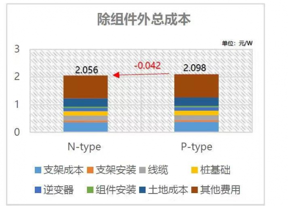 同尺寸的组件版型, N型组件比P型组件在单片组件上功率要高出15-20瓦。则意味着功率提高了2.67%,在实际项目中,以100兆瓦的电站举例,单片组件功率增高,整个电站使用的组件数量减少,则有效节约支架成本,支架安装成本,线缆成本,组件安装成本,土地面积等(见表1)。综合算下来,2.67%的功率提升则可给除组件以外的EPC成本节约至少有0.04元/W33682231074027