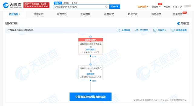 天眼查App显示,近日,宁夏隆基光电科技有限公司成立,法定代表人为常鹏飞,注册资本2亿人民币,经营范围包括光伏设备及元器件制造;光伏设备及元器件销售;合同能源管理;信息系统运行维护服务;太阳能发电技术服务;新兴能源技术研发等。股权穿透图显示,该公司由隆基绿能科技股份有限公司间接全资控股。