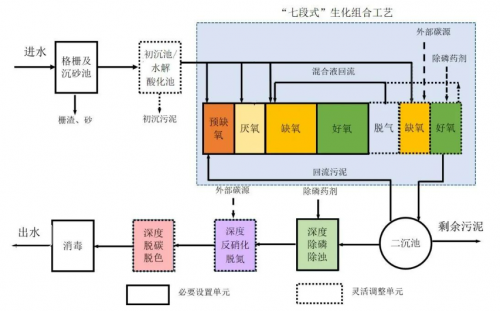 典型的基于“七段式”生化组合工艺的提标工艺路线图