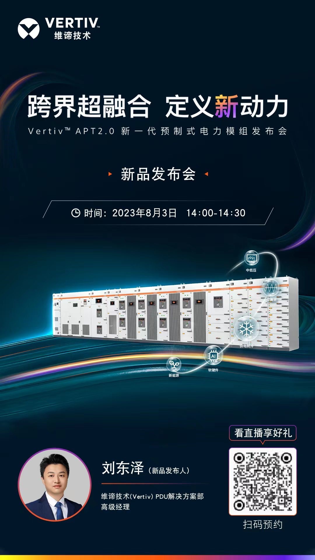 8月3日,14:00-14:30,维谛技术(Vertiv)诚邀您观看Vertiv™ APT2.0 新一代预制式电力模组新品发布会 :跨界超融合,定义新动力!一起见证未来所需的新一代预制式电力模组,跨界超融合科技力量,引领低碳时代数据中心动力模式!