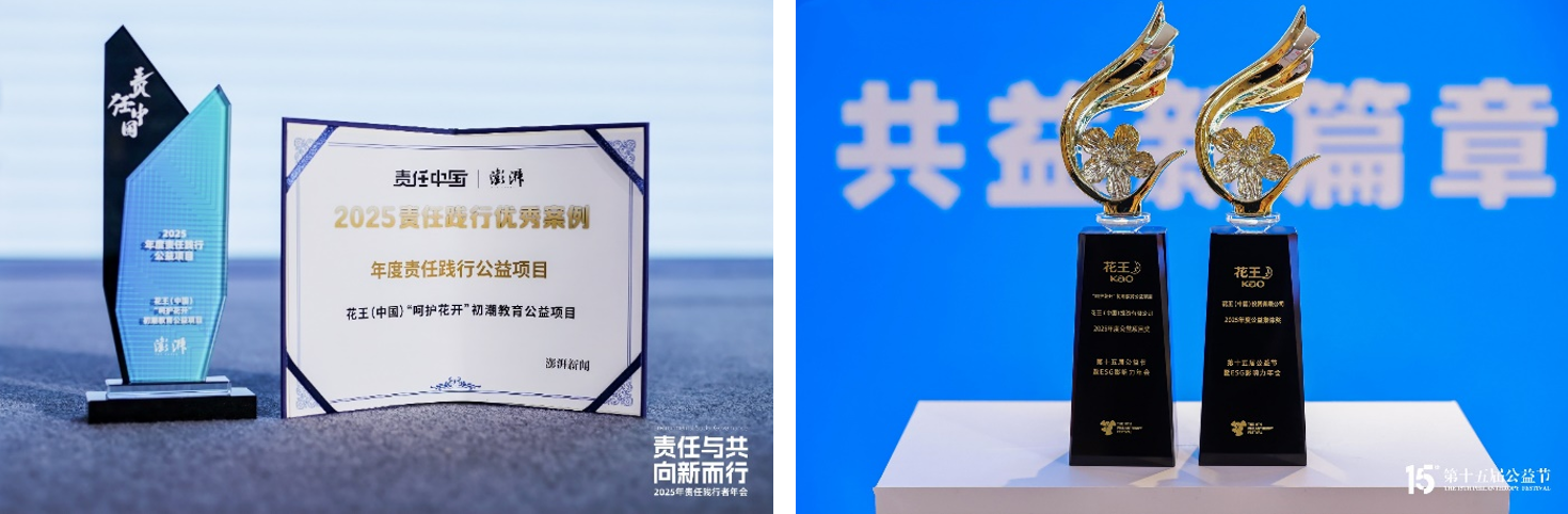 2025年,花王(中国)细水长流的公益坚守和长期扎实的ESG实践也获得了社会各界的高度认可,于多个维度斩获重量级奖项。例如,在可持续产品与包装创新领域,花王(中国)于2025国际零碳节获评“2025年绿色材料创新应用奖”,碧柔自在卸妆系列获评“2025杰出绿色包装引领奖”; 芙丽芳丝净润卸妆油在价值共创ESG评选中获评“可持续产品创新奖”等。在社会公益与企业责任领域,花王(中国)发起并持续推进的“呵护花开”初潮教育公益项目,先后在澎湃新闻主办的2025责任践行者年会上获评“年度责任践行公益项目”,并于第十五届公益节荣膺“年度公益项目奖”。在企业治理与ESG实践领域,花王(中国)获颁第十五届公益节“2025年公益集体奖”等等。这些奖项是荣誉的象征,也是责任的刻度,更是社会各界对花王(中国)可持续发展理念的高度认同,激励企业在责任之路上继续前行。