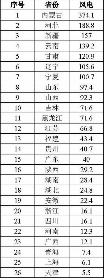 表2:2016年1~11月各省风电发电量(单位:亿kWh)