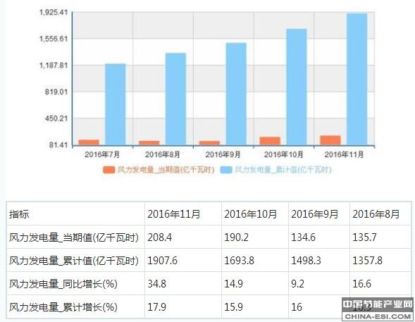 2016年11月我国当月风力发电量208.4亿千瓦时,累计发电量1907.6亿千瓦时,同比增长34.8%,累计增长17.9%。