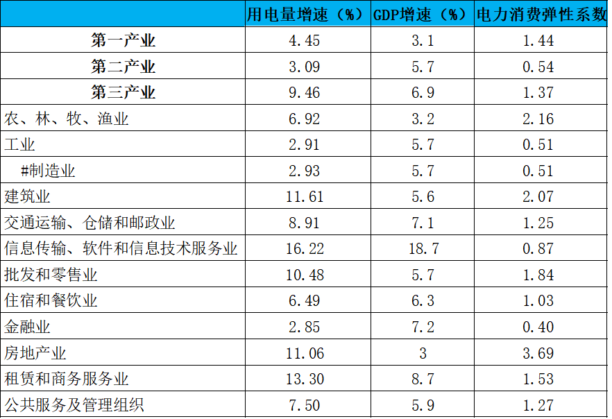 具体到各行业用电及GDP增速,请看下表: