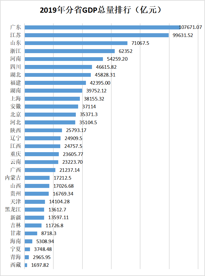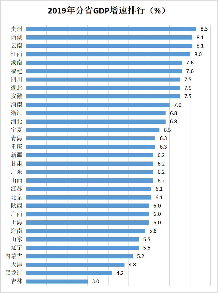 2019年全国分省GDP总量及其增速如上两图所示:从GDP总量看,广东(107671.07亿元)最高,西藏(1697.82亿元)垫底;从GDP增速看,贵州最快,为8.3%,吉林垫底,增速仅3.0%。