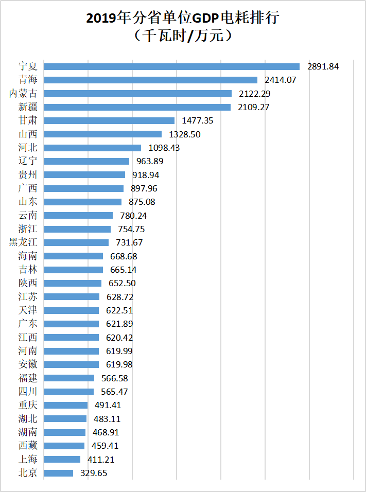 2019年,我国单位GDP电耗为729.21千瓦时/万元。各省每万元单位GDP的电力消耗情况又如何呢?请看下图排行。