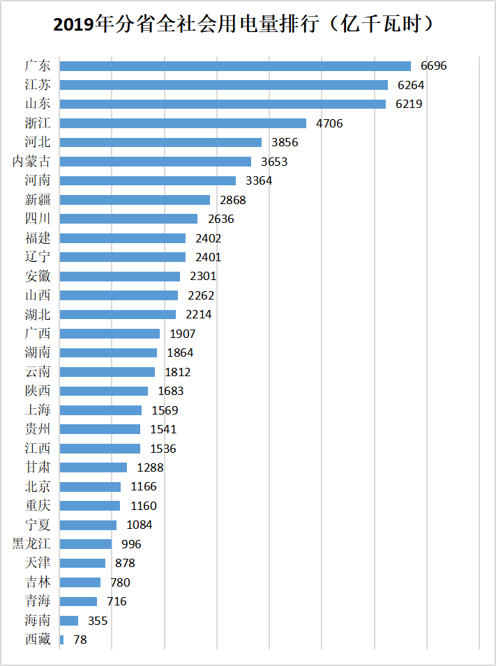 2019年全国分省全社会用电量及增速排行如上两图所示:从用电量看,广东(6696亿千瓦时)第一,西藏(78亿千瓦时)垫底;从用电量增速看,西藏以12.4%的增速排第一,青海(-3.0%)垫底。