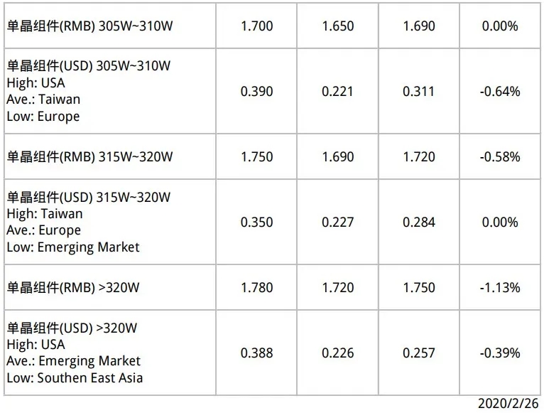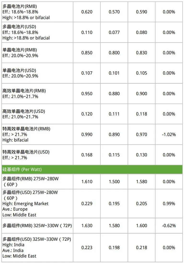 国内60片的275W~280W产品维持不变在1.50~1.61RMB/W,72片的325W~330W产品维持不变在1.58~1.63RMB/W,305W~310W产品维持不变在1.65~1.70RMB/W,315W~320W产品修正区间至1.69~1.75RMB/W,均价下调至1.72RMB/W,>320W产品维持不变在1.72~1.78RMB/W,均价下调至1.75RMB/W。