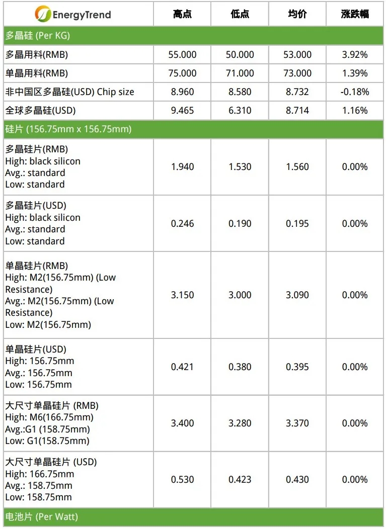 国内156.75mm多晶硅片产品维持不变在1.52~1.56RMB/Pc,黑硅产品维持不变在1.94RMB/Pc,铸锭单晶产品维持不变在2.60~2.65RMB/Pc。156.75mm单晶硅片产品维持不变在3.00~3.13RMB/Pc,大尺寸158.75mm单晶硅片产品维持不变在3.28~3.37RMB/Pc,166.75mm单晶硅片产品尺寸维持不变在3.40RMB/Pc。