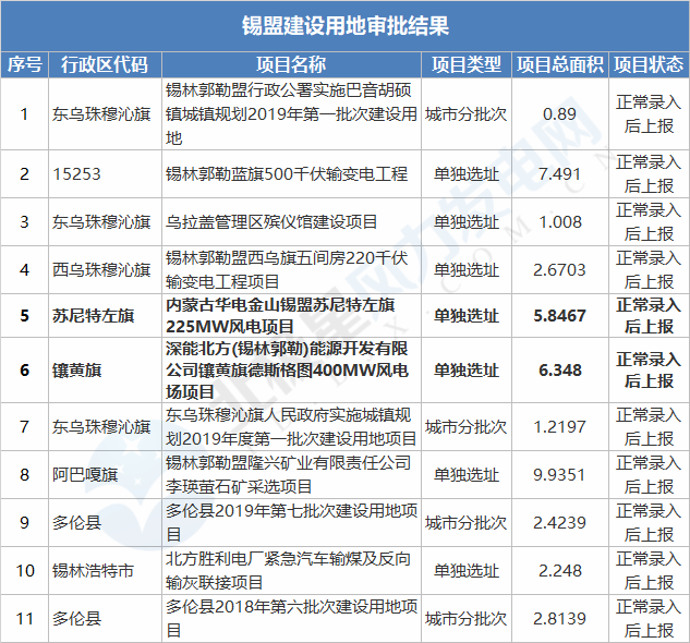 分别为:内蒙古华电金山锡盟苏尼特左旗225MW风电项目、深能北方(锡林郭勒)能源开发有限公司镶黄旗德斯格图400MW风电场项目、斯能阿巴嘎旗3号风电场一期150MW风电项目、华润电力新能源投资有限公司太仆寺旗300MW风电项目、内蒙古华电苏尼特左旗满都拉图一期100MW风电项目、内蒙古京能苏尼特风力发电有限公司30万千瓦风电项目;
